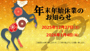 年末年始休業は12/30(火)~1/5(月)までお休みをいただくことになりました。