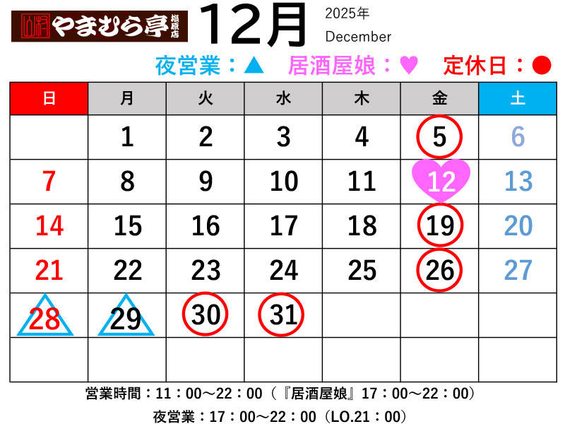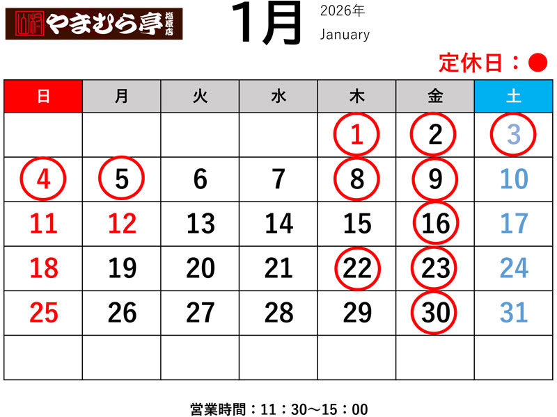 やまむら亭「12月・1月営業カレンダー」