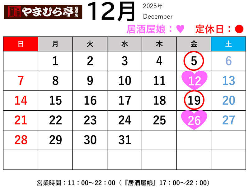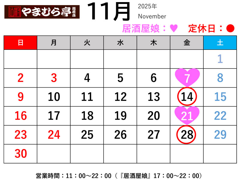 【居酒屋娘営業日(金曜日)】:11/7、11/21、12/12、12/26 【時 間】:17:00~22:00